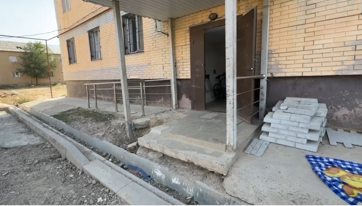 Түркістан облысы Қазығұрт ауданында мүгедектер мен жетімдерге берілген үйлерге жетудің өзі дені сау адамға да оңай емес: жолдың бойынан әртүрлі құбырлар мен арматура шығып жатыр, ал кіреберістегі баспалдақ не бұзылған, не мүлде салынбаған.