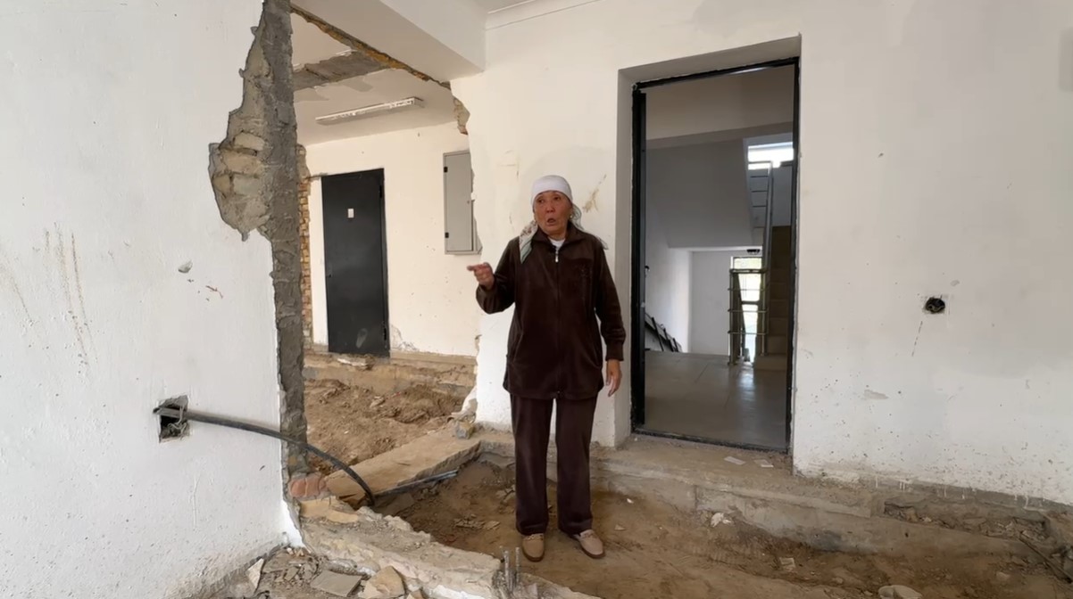 Қарт әйелдің айтуынша, жаңа пәтерде тұру қорқынышты. Қасындағы екі пәтер қазірдің өзінде құлап қалған: онда терезе де, есік те, қабырға да жоқ – тек үйінділер ғана қалған.
