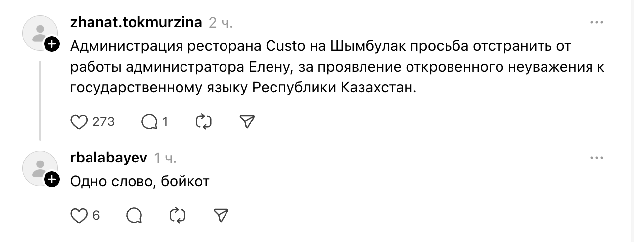 - Шымбұлақтағы Custo мейрамханасының әкімшілігінен Қазақстан Республикасының мемлекеттік тіліне ашық түрде құрметсіздік танытқаны үшін әкімші Еленаны қызметтен шеттетуді сұраймыз.