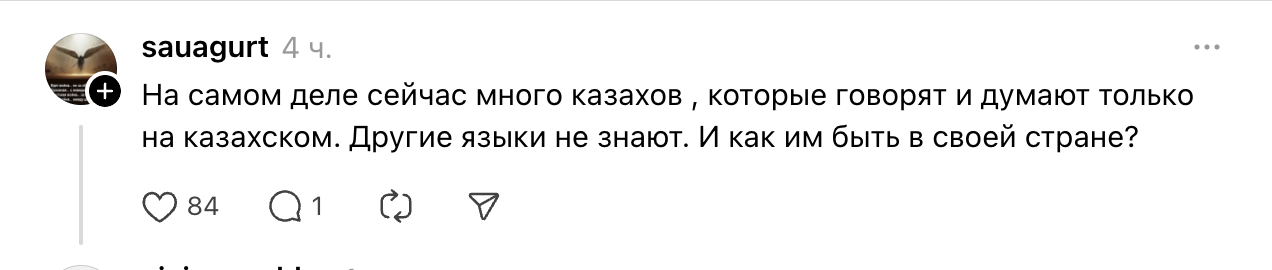 - “Бұл жерде ешкімнің қазақ тілінде сөйлемеуі проблема ма не? Осы сөзді мен Шымбұлақтағы Gusto мейрамханасының әкімшілігінен естідім. Әкімшісінің есімі — Елена. Мен өте сабырлы түрде бір ғана сұрақ қойдым: мейрамханада қазақ тілінде сөйлейтін даяшы бар ма деп. Жауап ретінде — боқтық, қорлау жәнеде кейін артынан мынадай да сөздер айтылды: — «Мен КСРО-да туғанмын және қазақ тілінде сөйлеп, қызмет етуге міндетті емеспін. Маған қазақ тілі керек емес”, – дейді автор.