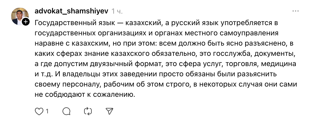 Бұл жайтқа қатысты адвокат та пікір білдірген. Ол мемлекеттік тіл – қазақ тілі, ал орыс тілі мемлекеттік ұйымдарда және жергілікті өзін-өзі басқару органдарында қазақ тілімен тең қолданылатынын атап өткен.