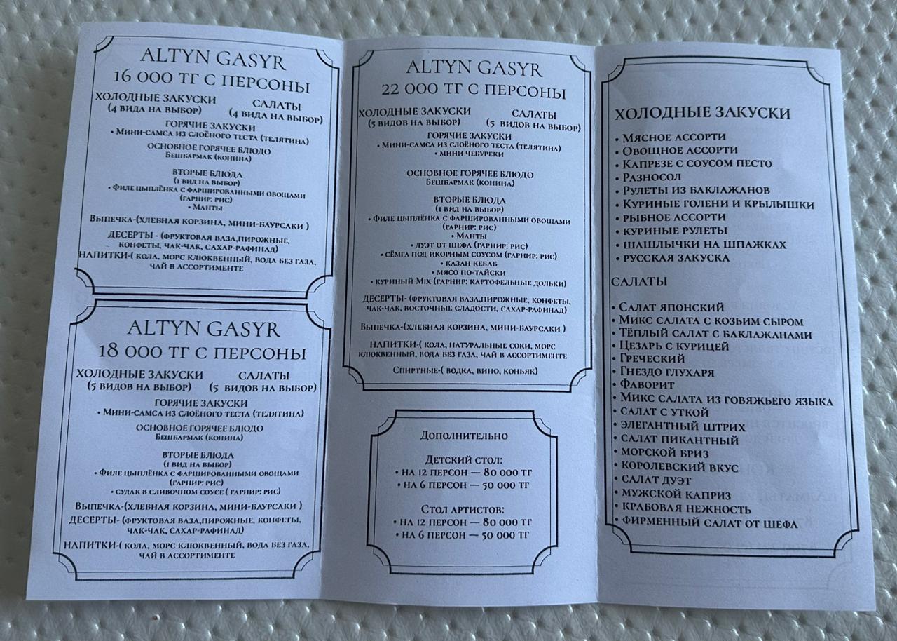 Бізді мейрамхана қарастырып жүрген ата-ана деп түсінген қызметкер ас мәзірін, кеш өткізетін үлкен залды таныстырды. Құны 16 мың теңгеден 22 мың теңгеге дейін баратын үш түрлі мәзірде тағамның түр-түрі самсап тұр. Тағамнан бөлек музыкалық жабдықтарды жалға алуға 180 мың теңге төлеу қажет екен.