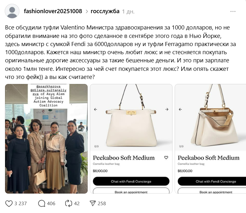 - Бәрі министрдің Valentino-сын талқылап болған шығар. Бірақ қыркүйекте Нью-Йоркте түскен суретіне ешкім мән бермеді. Бұл жерде министр құны 6 мың долларлық Fendi сөмкесі мен Ferragamo брендінің шамамен 1000 долларлық аяқ киімін киіп алған. Біздің министр люкс киімдерді жақсы көретін сияқты және қымбат заттарды алудан ұялмайтын көрінеді. Ал жалақысы шамамен 1 миллион теңге. Люкс киімдерді кімнің есебі арқылы алып жүр екен? Әлде бұл жолы да фейк деп құтылар ма екен? Қалай ойлайсыздар?, – дейді жазба авторы.