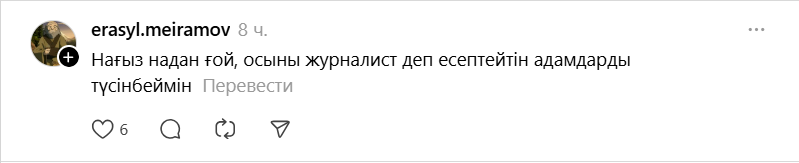 - Асеке астанавись, тым қатты кетіп бара жатырсың. Қазақтың тақиясын приколға тығып не көрінді саған? Күлдіремін деп бүлдіріп алдың бәрін.Әкімдердің қыр соңынан қалмай сұхбат алып, репортаж жасайтын Асхат Ниязов деген журналистің не айтып отырғанын қараңыздар. Қазақы тақияны қағытпасына қосып, қорлап отыр. Ресейде туылып, орыстардың ортасында өскен жігіт. Өресі қазақылықты әлі қабылдамапты. Қазақтың ұлттық киімдерін, салт-дәстүрін сыйламасаң, “Обожаю” деп кімге немесе нені айтып жүрсің?, – дейді Диас Нұрақын (орфография мен пунктуация сақталды).