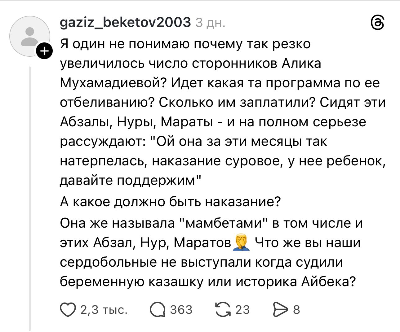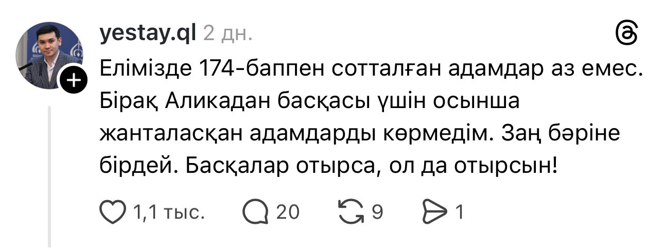 Айта кетейік, депутаттың бұл сөзі Алика Мұхамадиеваның ісімен байланысты болуы мүмкін. Себебі Алика ісі бойынша сот басталғаннан кейін әлеуметтік желіде оны ақтауға арналған жазбалар көбейіп кеткен.
