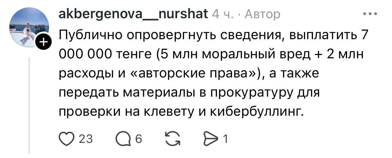 - Мәліметтерді жария түрде теріске шығаруды, 7 000 000 теңге төлеуді (оның ішінде 5 млн теңге – моральдық залал, 2 млн теңге – шығындар мен «авторлық құқықтар»), сондай-ақ материалдарды жала жабу мен кибербуллинг фактісі бойынша тексеру үшін прокуратураға беруді талап етті, дейді Нұршат.