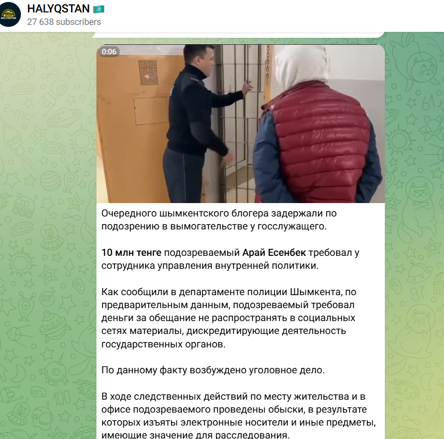 Бұған дейін Шымкентте шенеуніктен 10 миллион теңге бопсалаған журналист әрі блогер ұсталғанын хабарлаған едік. Halyqstan мәліметінше, ол Аманат партиясының экс-қызметкері Арай Есенбек болып шыққан. Айта кетейік, Есенбектің ұсталғаны туралы журналист Михаил Козачков та жазған.