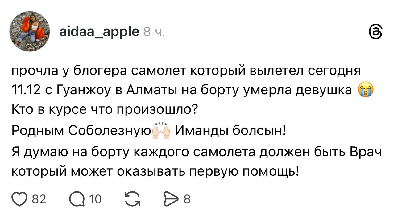 Еске салайық, бұған дейін Ақтөбе – Алматы рейсіндегі ұшақта да қайғылы оқиға болған еді. Бір жолаушының жағдайы кенет нашарлап, әуе кемесі шұғыл түрде әуежайға оралды. Дәрігерлер жолаушының қайтыс болғанын растады.
