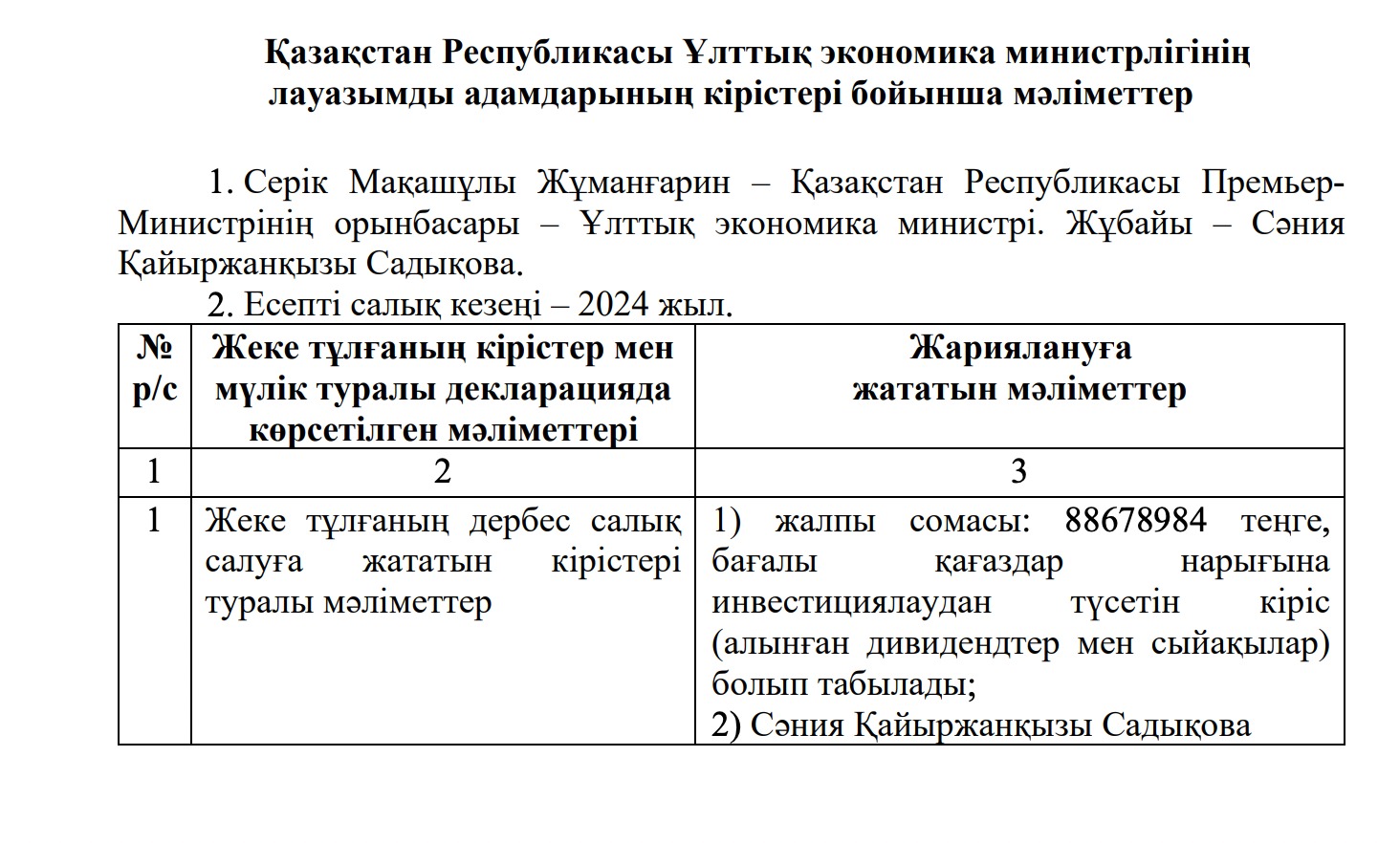 Ұлттық экономика министрлігінің сайтында жарияланған мәліметке қарағанда, есепті салық кезеңінде көрсетілген табыс министрдің өзіне емес, оның жұбайы Сәния Садықоваға тиесілі.