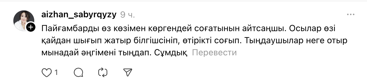 - Пайғамбарды өз көзімен көргендей соғатынын айтсаңшы. Осылар өзі қайдан шығып жатыр білгішсініп, өтірікті соғып. Тыңдаушылар неге отыр мынадай әңгімені тыңдап. Сұмдық.