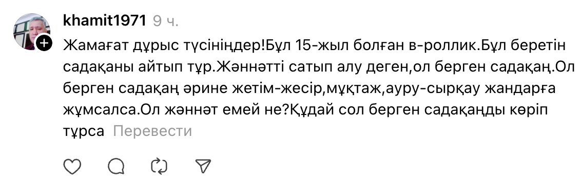 - 700 мыңның ақшасын бересің, 7 миллиардтың проблемасын шешесің. 700 мың теңге бересің, 7 миллионмен құтылмайтын бәлелерден құтыласың. 700 мың теңге бересің, пайғамбарымыз жәннатты сатып алды деген сахабаны көрсетті. Жәннатты сатып алатын адамдар болады, білесіздер ме? Қажылыққа 7 мың доллар ақша беріп, жәннаттық болып келетін адамдар бар. Олар жәннатты тірі кезінде сатып алғандар. Бірақ олар 7 мың доллар төлеп едік қой деп міндетсінбейді. Құдай үшін бергеннен кейін артынан адамдардан ешнәрсе талап етіп, күтпейді, – дейді коуч.