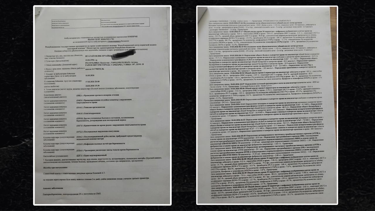 30 жастағы астаналық Еңлік Исатай №3 көпбейінді қалалық ауруханадағы дәрігерлердің салғырттығынан баласынан да, жатырынан да айырылды. Оқиға 17 наурыз күні болған. Біліксіз дәрігерлер бар кінәні Еңліктің өзіне артып, шығарып салған. Сап-сау келіншектің қазір бүйрегі ағарып, қан қысымы түспей жүр. 102 мен Е-өтінішке шағымданса да, еш қайыры болмаған. Ulysmedia.kz тілшісі кейіпкермен сөйлесіп, мәселенің мән-жайын сұрады.