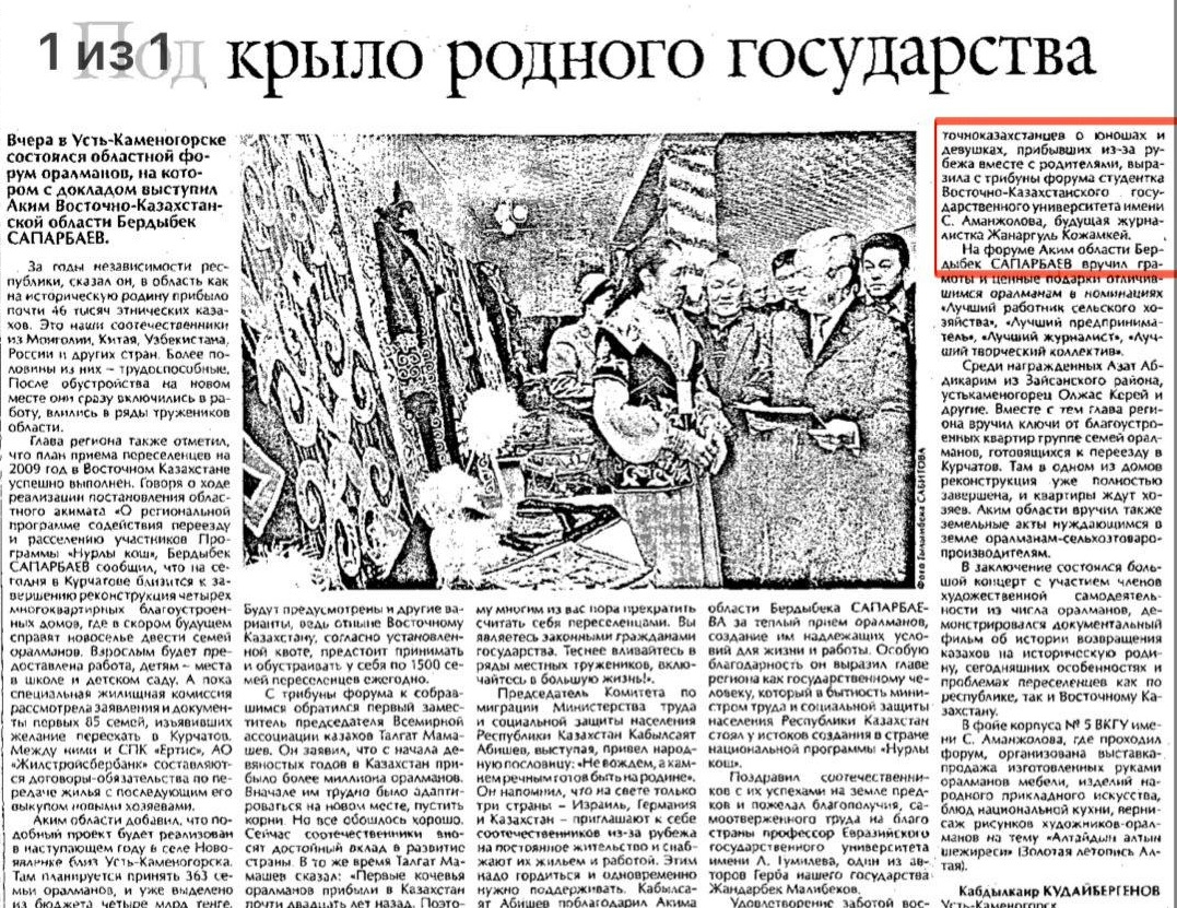 Тағы бір басылымда оның Өскемендегі оралмандар форумында мінберден сөз сөйлегені жазылған.
