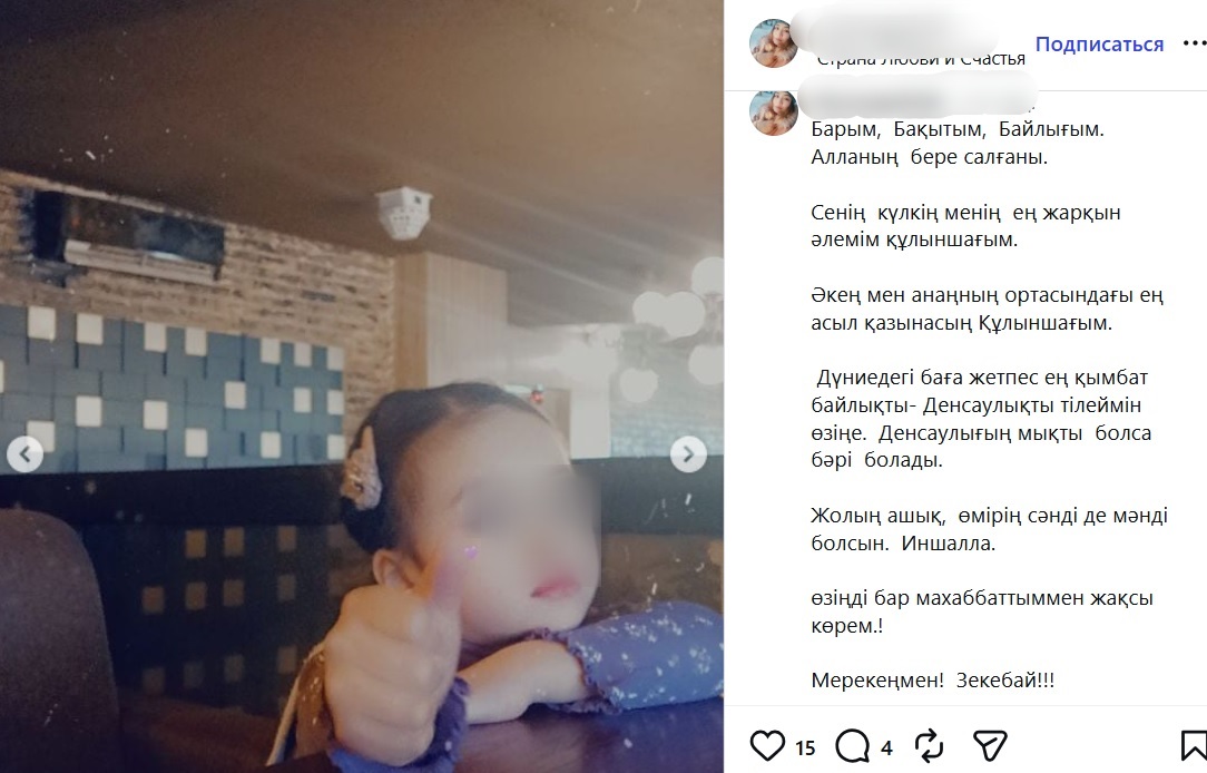 Дүкеннің Instagram парақшасын белсенді жүргізген келіншек өзінің жеке парақшасына 2021 жылдан кейін ештеңе жүктемеген. Оған дейін жариялаған контентінің дені – тұңғышының суреттері.
