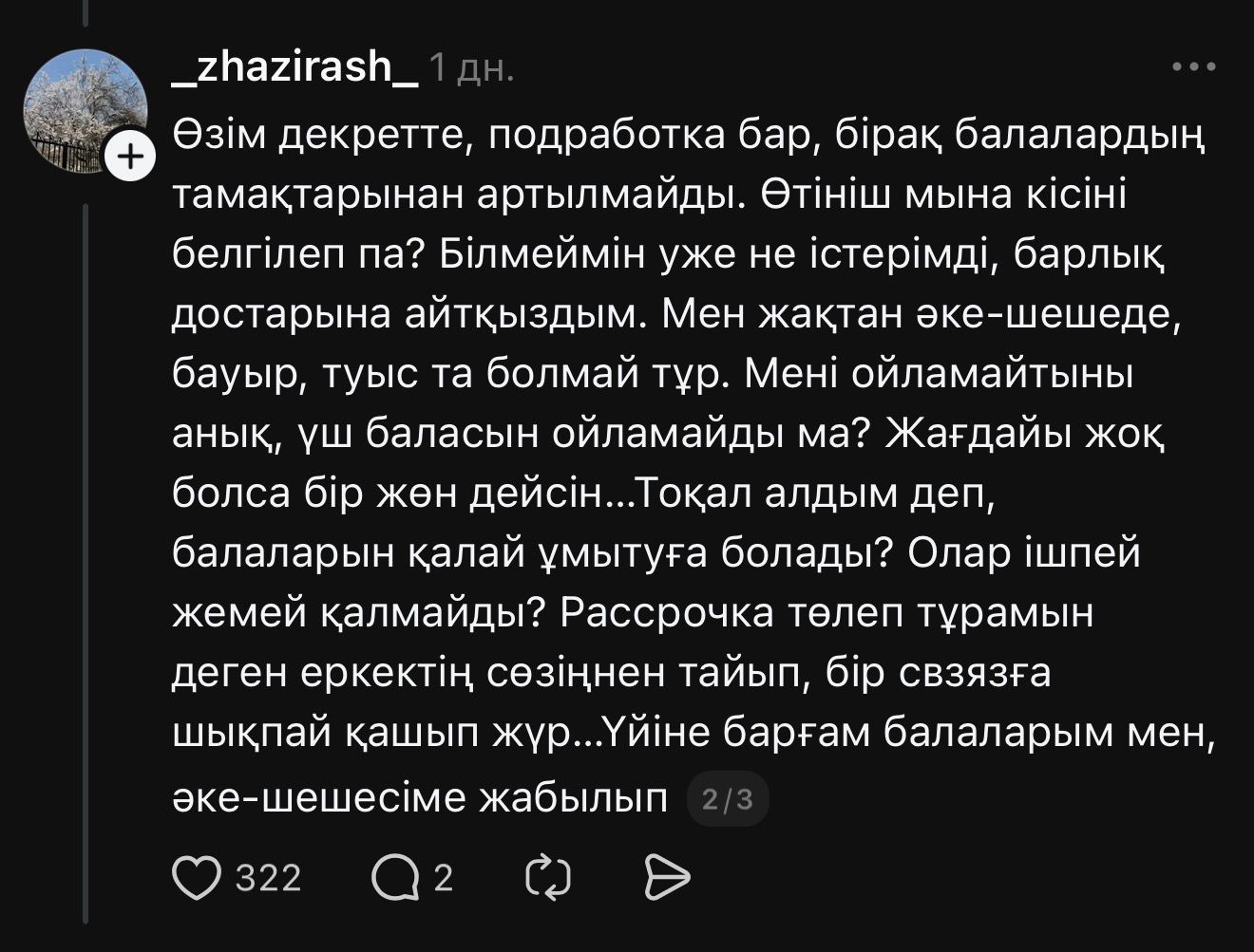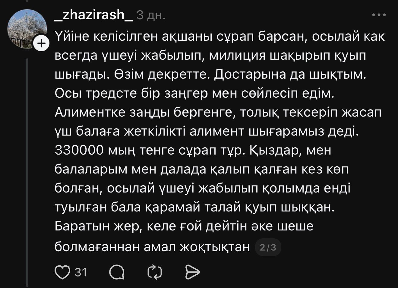 –Бұрынғы күйеуім маған айфон алдырып, мобилогрф боламын деді. Артынан түк болмағандай тоқал алып, қыдырып жүр. Қызбен SMM курс оқып жүріп танысыпты. Енді екі ай болды, не несиені төлемейді, не алимент төлемейді. Не үлкен адам сияқты байланысқа шықпайды. Үш балам не жеп, не ішіп жатыр деп ойлап отырған жоқ. Әкесі жазушы, анасының атында қаншама пәтерлері бар. Төлеймін десе бір күнде бәрін жауып тастауға жағдайлары жетеді. Толық жауып берсе мүлдем байланысқым келмейді. Қазір бірақ басқа амалым жоқ, – деп жазды Жазира.
